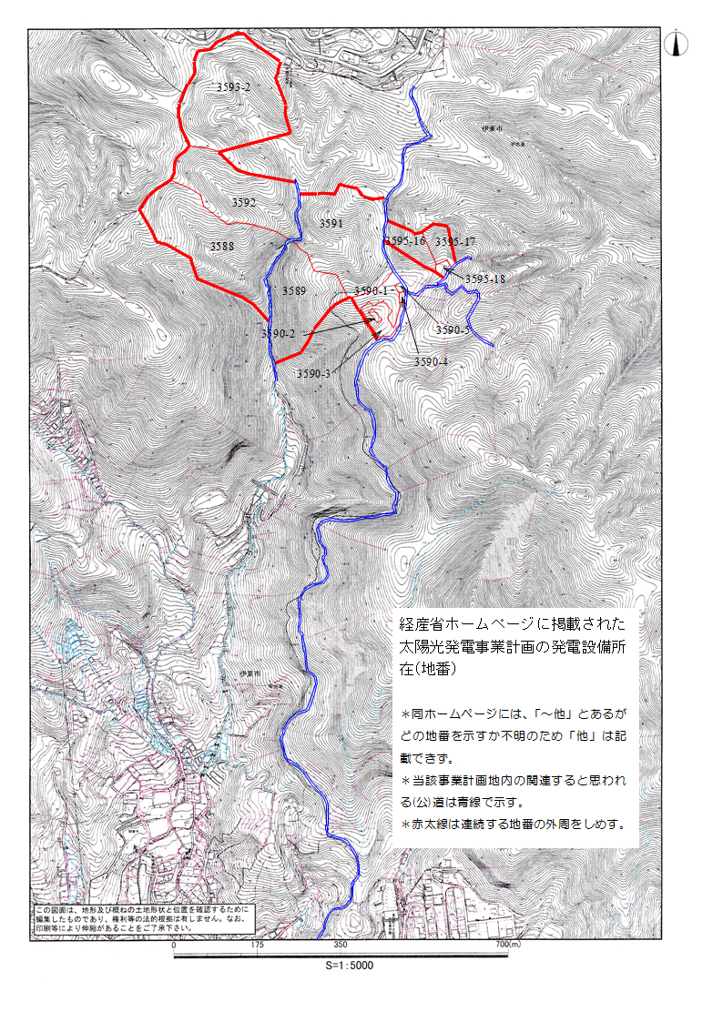 公開された資料に記載された事業計画地の地番を地図上に落とした地番位置図